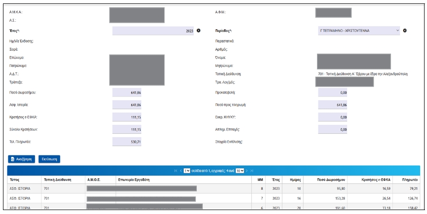 Μετά την επιτυχή αναζήτηση, προβάλλονται τα ταυτοποιητικά στοιχεία του εργαζομένου: