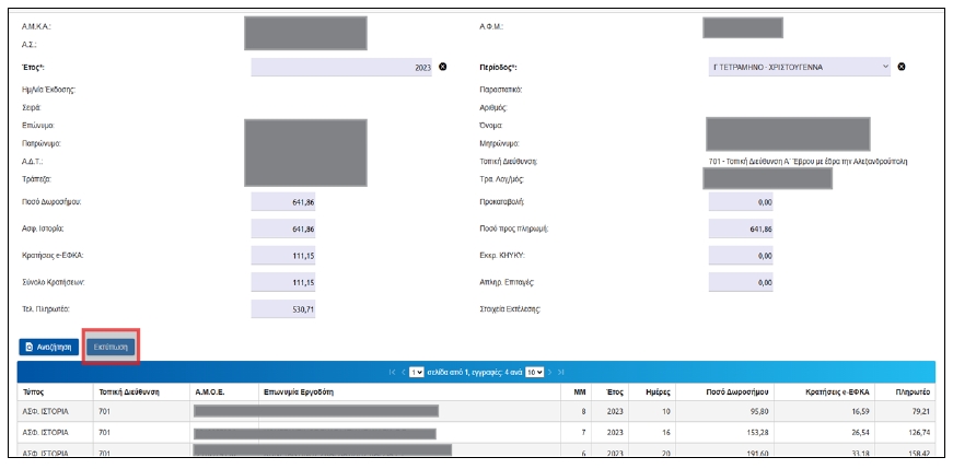 Στον πίνακα ανάλυσης εμφανίζεται διακριτή εγγραφή για κάθε μήνα, όπως έχει προκύψει από την ασφαλιστική ιστορία με το σύνολο των ημερών του μήνα, το ποσό Δωροσήμου που αντιστοιχεί στο μήνα, οι κρατήσεις e-ΕΦΚΑ που αντιστοιχούν στο μήνα και το πληρωτέο ποσό.