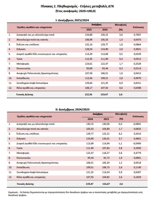 Από τη σύγκριση του Γενικού ΔΤΚ του μηνός Δεκεμβρίου 2025 με τον αντίστοιχο Δείκτη του Δεκεμβρίου 2024 προέκυψε αύξηση 2,6%